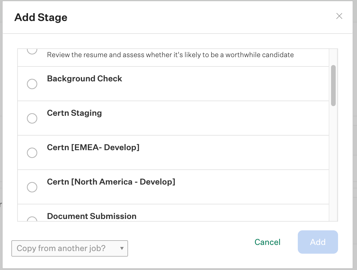 - A popup will appear where you can select and add the "Certn {Region}" as a stage in your candidate screening procedures.