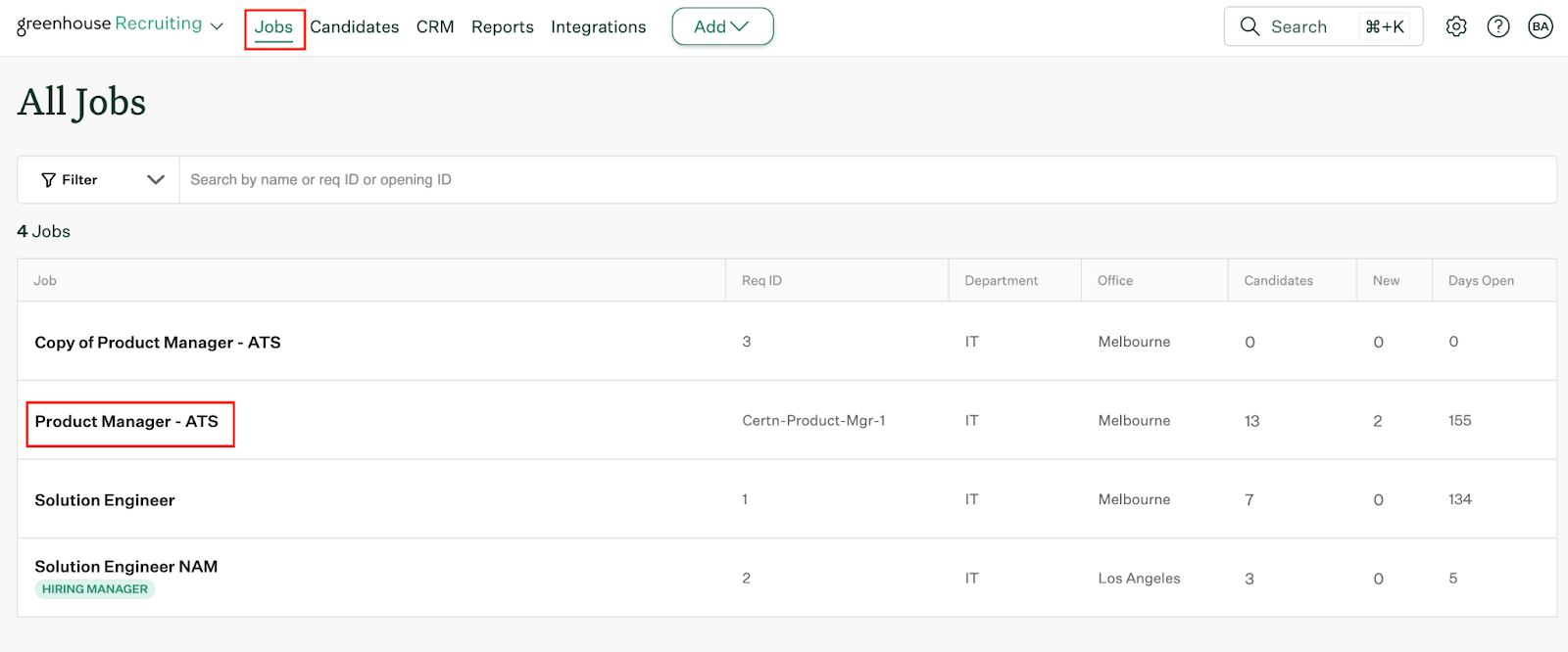 - From the "All Jobs" tab in Greenhouse, select the job that you want to run background checks for.