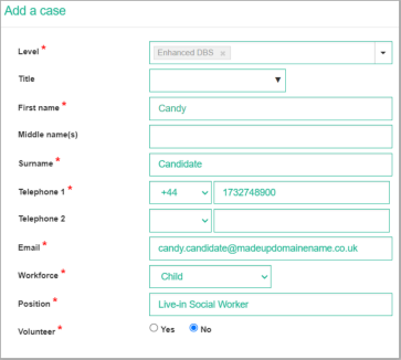 When adding a case to an SLA which includes an Enhanced DBS check, you are required to provide additional information, including the workforce the candidate will be entering, their position and whether they are entering a volunteer role.