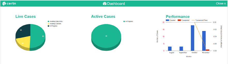 Active Cases are cases that are currently in-progress with an assigned Analyst. The performance graph to the right shows you an overview of activity in the current and previous three months, and both created and completed cases against the average turnaround time.
