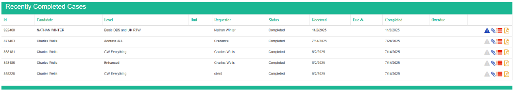 6. Lastly, the Recently Completed Cases section displays your five most recently completed cases. You can click on any of these cases to quickly navigate to the case file for more information: