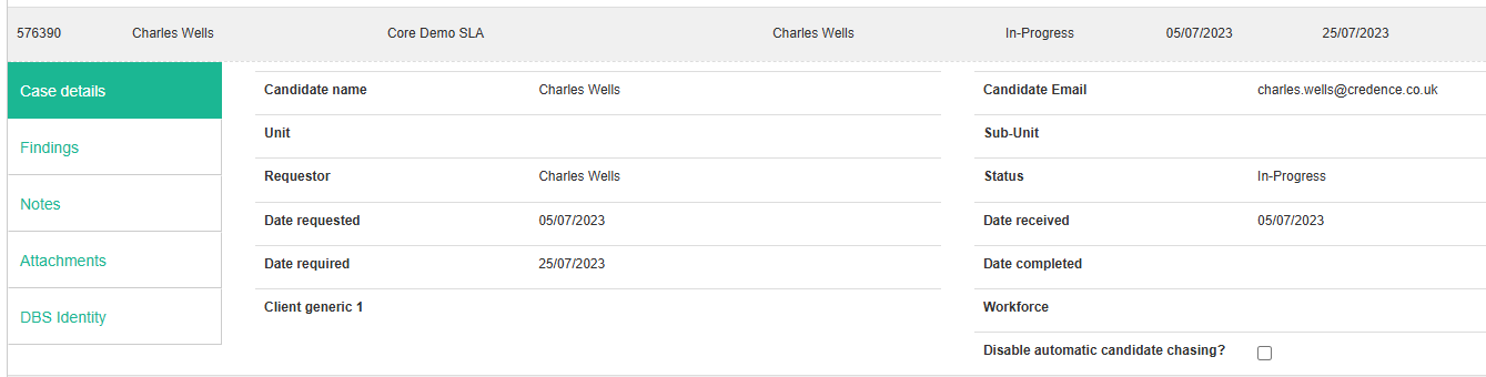 Case Details – This shows the basic information relating to the case, such as Candidate Name, Candidate Email Address, Requestor, Level, Date Requested and Date Required.