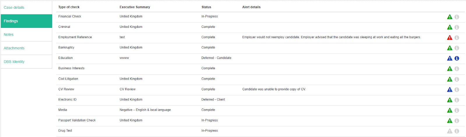 3. If there is a note in the enquiry log the icon to the right of the alerts will be coloured in green. Clicking on this icon will show you notes left directly by the analyst with regards to this check.