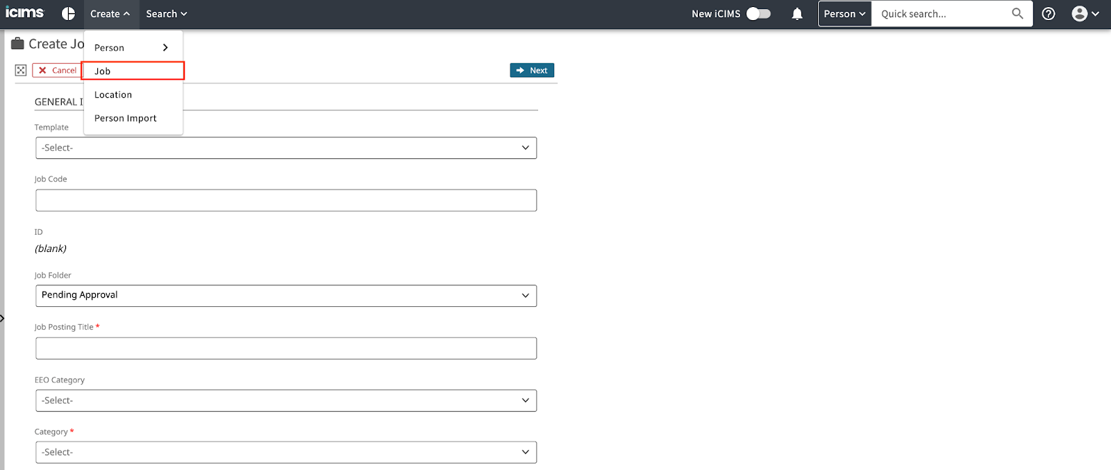 From the "Create" menu in ICIMS, select “Job” and begin filling out all relevant information for the job.