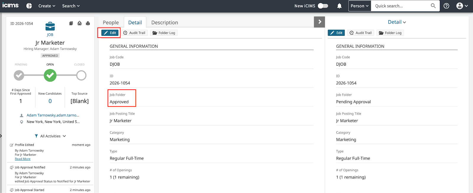 - Once the job is created, mark it approved by the appropriate stakeholders in ICIMS. You can do this by editing the details of the job and setting “Job folder” to “Approved”.