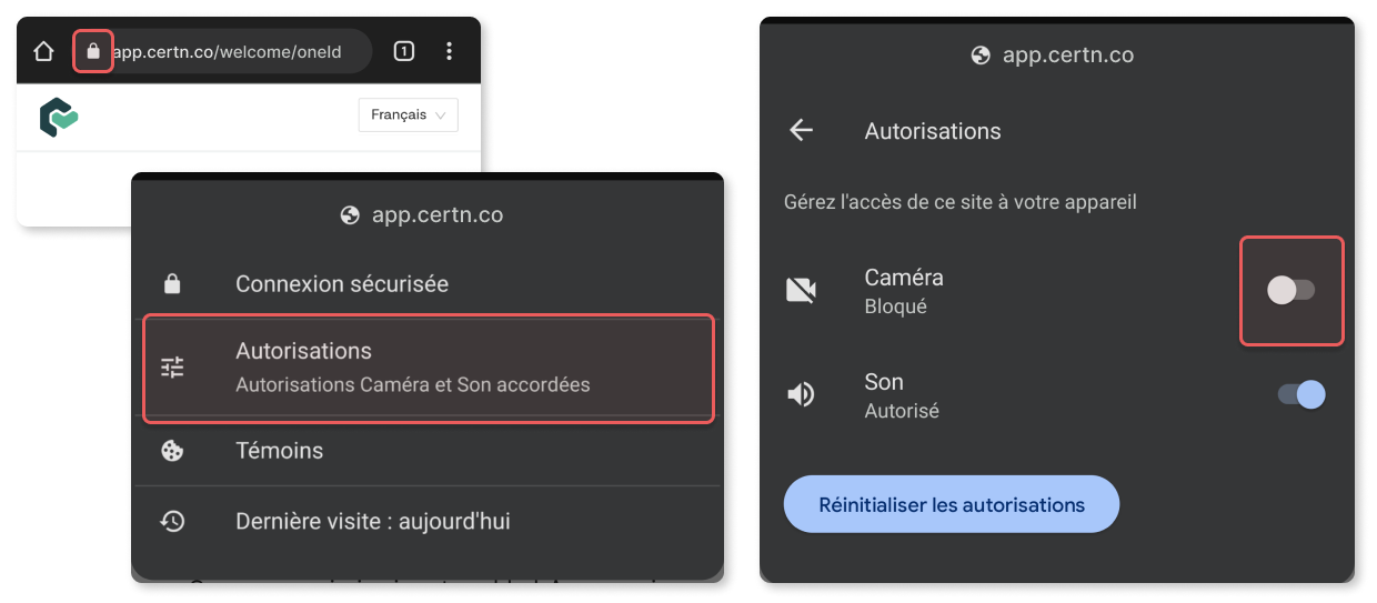Si vous sélectionnez Bloquer, sélectionnez l’icône de verrouillage ou de caméra dans la barre de recherche, sélectionnez Autorisations, puis sélectionnez la Caméra pour l’activer. Lorsque vous avez terminé, touchez l'écran à l’extérieur du menu pour le fermer. Pour appliquer les modifications, vous devrez peut-être recharger la page.