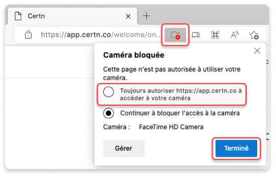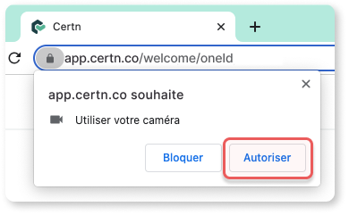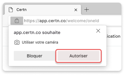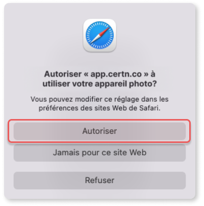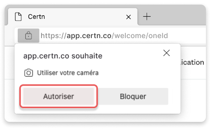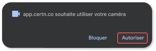 Lorsque notre application web demande l’accès à votre caméra, une invitation apparaît automatiquement. Sélectionnez Autoriser pour activer votre caméra.