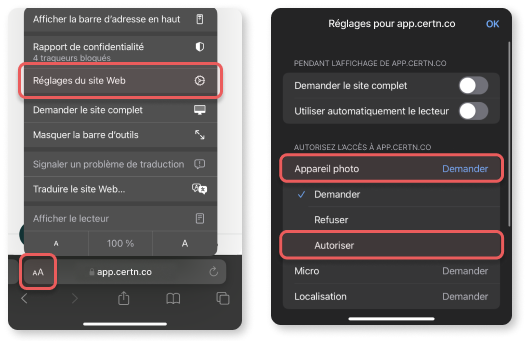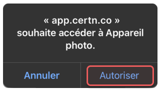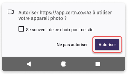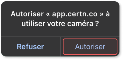 Lorsque notre application web demande l’accès à votre appareil photo, une invitation apparaît automatiquement. Sélectionnez Autoriser pour activer votre caméra.