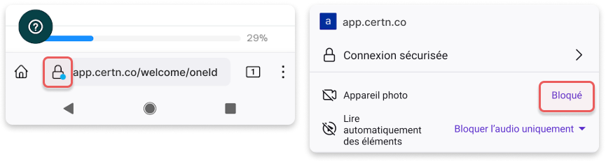 Si vous avez sélectionné Ne pas autoriser et que la case Se souvenir de ce choix pour ce site a été cochée, Sélectionnez l’icône de verrouillage ou de caméra dans la barre de recherche, puis, à côté de Caméra, sélectionnez Bloqué. L’étiquette Bloqué passera à Autorisé. Lorsque vous avez terminé, touchez l'écran à l’extérieur du menu pour le fermer. Pour appliquer les modifications, vous devrez peut-être recharger la page.