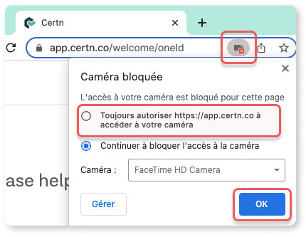 Pour effectuer certaines vérifications d'identité avec Certn, vous prenez une photo de vous-même pour verifier votre identité. Cet article vous aide a activer votre caméra dans votre navigateur afin que vous puissiez effectuer la vérification.